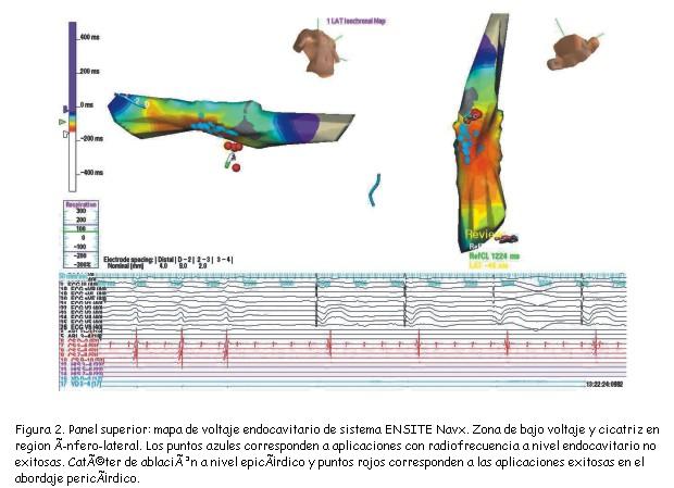 En los últimos años se ha demostrado que los circuitos epicárdicos son más frecuentes en miocardiopatías no isquémicas (miocardiopatía chagásica, displasia arritmogénica de ventrículo derecho) y en algunas TV idiopáticas(9-12). Además de la cardiopatía de base existen otros datos que pueden hacer sospechar el origen epicárdico, como determinadas características electrocardiográficas y de las técnicas de imagen, así como datos en los mapas de voltajes endocárdicos(13-15).