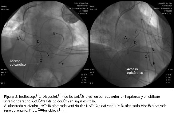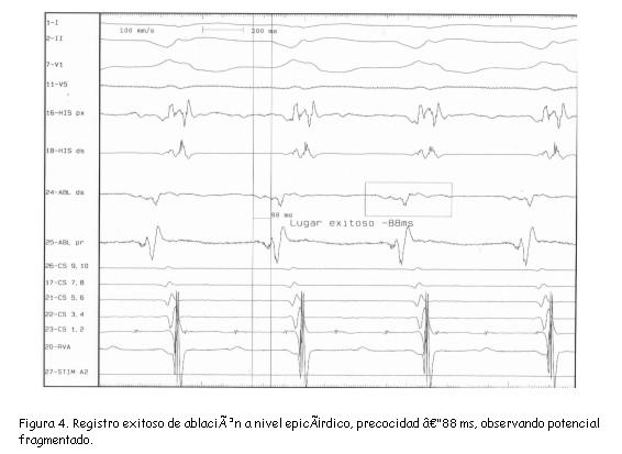 El abordaje epicárdico no es una opción reciente para el tratamiento de TV. En 1996, Sosa y colaboradores describieron este abordaje como un método factible y seguro para realizar en el laboratorio de electrofisiología en pacientes portadores de enfermedad de Chagas y TV recurrente, demostrando la existencia de circuitos subepicárdicos(3-5). Este mismo grupo posteriormente demostró su utilidad en pacientes con infarto previo y TV(6); otro grupo describió su utilidad en la TV incesante(7). El abordaje epicárdico en pacientes sin antecedentes de cirugía cardíaca es accesible, así como la movilización de los catéteres en esta cavidad; se recomienda tener una referencia de la anatomía coronaria, ya sea mediante una angiotomografía multicorte (cuya imagen puede fusionarse con la geometría ventricular creada en el sistema de navegación) o una angiografía coronaria, para evitar aplicar RF sobre una arteria epicárdica. Ninguno de estos métodos se emplearon en nuestro caso; la emergencia particular de la situación clínica, la necesidad de interrumpir la arritmia y la situación anatómica del sitio de origen epicárdico alejado de vasos importantes, fueron los motivos considerados. Esta conducta es respaldada por algunos autores(8).