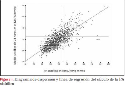 Tanto las investigaciones epidemiológicas que demostraron los daños de la HTA, como los ensayos clínicos que mostraron el beneficio del tratamiento antihipertensivo, tuvieron como base a la PA de consultorio(18). La introducción del MAPA planteó la necesidad de establecer cuál era el valor normal de la PA para este método, necesariamente diferente al incluir datos de los períodos diurno y nocturno, los que están influenciados por la actividad del individuo. Con la finalidad de definir estos límites, investigaciones realizadas en poblaciones europeas y asiáticas analizaron la relación entre la PA medida en consultorio y la del MAPA de 24 horas mediante diferentes aproximaciones metodológicas(19-23). En 1999, nuestro grupo de trabajo en hipertensión arterial (Hugo Senra, Carlos Schettini, Manuel Bianchi, Fernando Nieto y Edgardo Sandoya) propuso, a partir de una investigación llevada a cabo en una muestra de 2.070 adultos seleccionados al azar, que el valor normal era 125/80 mmHg, cifra que mejor se correlacionó con los 140/90 mmHg en el consultorio (figura 1)(24). Eso llevó a que se propusieran diferentes valores de normalidad del MAPA, existiendo consenso en que su definición recién podría establecerse cuando se dispusiera de datos que permitieran relacionar la PA del MAPA inicial con los eventos cardiovasculares ocurridos a largo plazo