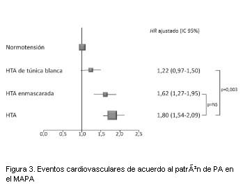 Como vimos, el MAPA permitió detectar a individuos con un patrón de PA normal en el consultorio y valores elevados fuera del mismo. Las posibles razones para no detectar PA elevada en la clínica, en particular por la mañana, incluyen el consumo de alcohol vespertino, la variación circadiana de la PA o la apnea obstructiva del sueño(37,38). La incidencia de eventos entre quienes tenían hipertensión enmascarada fue mayor que la de los normotensos (HR 1,62; IC 95% 1,27-1,95) y similar a la observada en la HTA (p = NS), de ahí la importancia de diagnosticar esta entidad (figura 3).