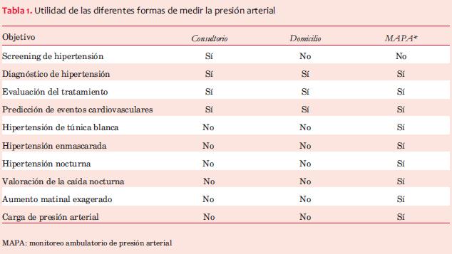 Actualmente se ha popularizado la medición de la PA por el propio paciente en su domicilio, lo que se ha visto facilitado por el desarrollo de equipos semiautomáticos validados de costo razonable. Es así que hoy se dispone de tres formas de uso habitual para medir la PA en pacientes ambulatorios, en muchos casos empleados de forma complementaria, y cada una de las cuales tiene su propia utilidad (tabla 1, modificada de[15]).