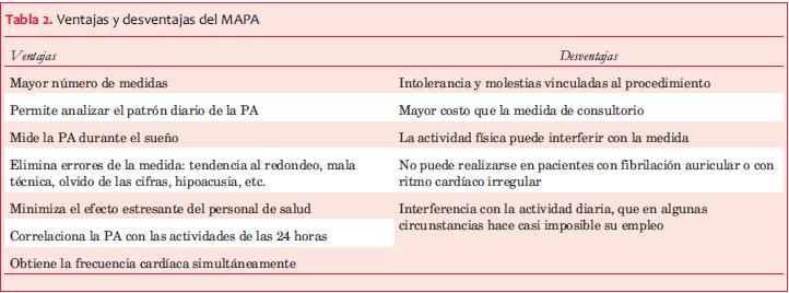 Como todo método diagnóstico, el MAPA posee ventajas y desventajas para el manejo de los pacientes en la clínica habitual, las que se resumen en la tabla 2. Entre las primeras, el registro de la PA durante las 24 horas permite mejorar el diagnóstico de la HTA, así como diagnosticar situaciones con implicancia pronóstica que de otra forma no serían reconocidas. Por otro lado, la medida de la PA, un acto médico importante, está sujeta a múltiples causas de error, debidas al equipo empleado, a las condiciones del paciente, al observador, así como a la técnica de medida. La causa más frecuente de error es la preferencia por el dígito, lo que lleva a redondear de 10 en 10 mmHg valores que no son tales, no consignándose el valor real de la PA. Esta tendencia al redondeo está tan arraigada en la práctica médica de nuestro país, que en una investigación reciente comprobamos que en la asistencia se registró la PA de 10 en 10 mmHg a pesar que el equipo semiautomático reportó en su pantalla las cifras al milímetro. En ese sentido, el empleo del MAPA evita muchos de los errores en la medida, particularmente los debidos al observador y a la técnica de medida.