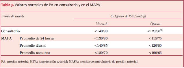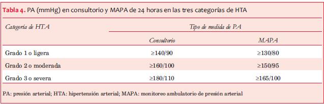 Dado que disponer de categorías es práctico en la clínica diaria, se ha propuesto definir categorías en el MAPA que se correlacionen con los diferentes de HTA(28). En la tabla 4 se presenta cada categoría de HTA con su equivalente en el MAPA de 24 horas (adaptado de[26,28]).