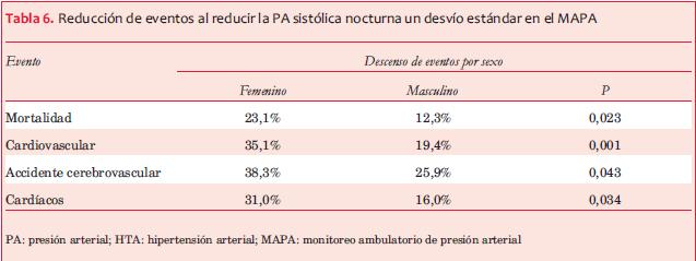 En IDACO las mujeres tuvieron menor riesgo cardiovascular que los hombres, pero la PA de 24 horas, y particularmente la nocturna, mostró una relación más marcada con los eventos cardiovasculares que la observada entre los hombres. La reducción de un desvío estándar de la PA sistólica en las mujeres se asoció a mayor reducción que en los hombres en mortalidad y en los eventos cardiovasculares, cerebrovasculares y cardíacos (tabla 6). Ello muestra la necesidad de definir la PA de 24 horas en las mujeres, puesto que si bien tienen menor riesgo que los hombres, el conocimiento de sus valores sistólicos nocturnos y de 24 horas permitirían definir mejor su riesgo(60).