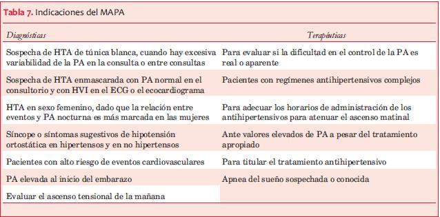 De acuerdo a lo reseñado, se puede dividir a las indicaciones del MAPA en aquellas que tienen finalidad diagnóstica y las que tienen finalidad terapéutica (tabla 7).