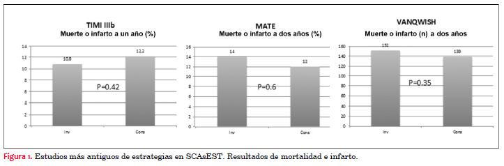 Varios estudios aleatorizados han comparado una estrategia de rutina invasiva con otra conservadora o selectivamente invasiva. Los primeros estudios no demostraron beneficio en el objetivo de reducir eventos duros como mortalidad o infarto agudo de miocardio (IAM) entre ambas estrategias (figura 1). Los estudios TIMI IIIb, el VANQWISH y el MATE constituyen los ejemplos de este período temprano, donde el uso de stent fue muy limitado, así como el uso de fármacos antitrombóticos enérgicos, como los inhibidores IIb-IIIa u otros que se generalizaron más tardíamente.