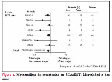El metaanálisis de Bravy y colaboradores(14 ), que incluyó siete trabajos (también el ICTUS) con 8.375 pacientes disponibles para el análisis, demostró el beneficio de la estrategia invasiva (figura 2). A una media de dos años hubo una reducción de la mortalidad global (4,9% versus 6,5%, RR 0,75; IC95%, 0,63-0,90; p=0,001) y de la incidencia de infarto de miocardio no fatal (7,6% versus 9,1%, RR 0,83; IC95% 0,72-0,96; p=0,012). Hubo también una reducción en la rehospitalización por angina inestable en una media de seguimiento de 13 meses (19,9% versus 28,7%, RR 0,69; IC95% 0,65-0,74; p < 0,0001).