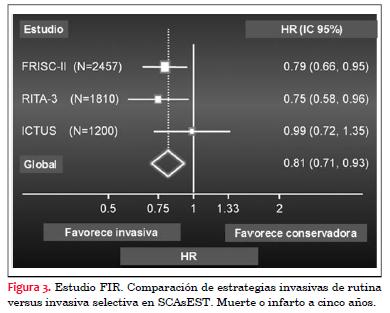 En el año 2010 se publicó un metaanálisis de Fox y colaboradores(16 )que incluyó los estudios FRISC II, ICTUS y RITA3 (FIR), con una evolución a cinco años. En 5.467 pacientes, una estrategia de rutina invasiva versus una estrategia conservadora (selectivamente invasiva), mostró diferencias significativas en mortalidad o infarto no fatal para la primera: 14,7% versus 17,9%, HR: 0,81, IC 95%: 0,71-0,93; p=0,002 (figura 3). La diferencia más marcada fue en infarto no fatal (10,0% versus 12,9%; p=0,001), con tendencias consistentes para muerte cardiovascular (HR: 0,83, IC95%: 0,68-1,01; p=0,068) y muerte global (HR 0,90, IC95%: 0,77-1,05; p=0,19).