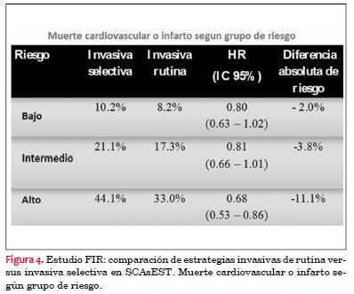 El metaanálisis FIR(16) demostró una reducción de la tasa mortalidad o infarto a cinco años en una estrategia invasiva de rutina. Sin embargo, cuando se estratifica la población del estudio por niveles de riesgo, los pacientes que claramente se benefician de esta estrategia son los de alto riesgo (definidos según un score derivado de la propia base de datos del estudio), no así los de riesgo medio o bajo (figura 4). Los resultados de mortalidad o infarto para la estrategia invasiva de rutina versus la estrategia conservadora (invasiva selectiva) fueron: 8,2% versus 10,2%, HR: 0,80 (IC95%: 0,63 a 1,02), diferencia de riesgo: –2,0% (IC95%: –4,1% a 0,1%) para los pacientes de bajo riesgo; 17,3% versus 21,1%, HR: 0,81 (IC95%: 0,66 a 1,01), diferencia de riesgo: –3,8% (IC95%: –7,4% a –0,1%) para los pacientes de riesgo medio, y 33,0% versus 44,1%, HR: 0,68 (IC95%: 0,53 a 0,86), diferencia de riesgo: –11,1% (IC95%: –18,4% a –3,8%) para los pacientes de alto riesgo.