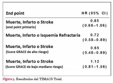 El estudio TIMACS(24 ) distribuyó al azar 3.031 pacientes con SCAsST para una intervención precoz (< 24 horas) versus una intervención diferida (£ 36 horas). El tiempo medio de la angiografía en el primer grupo fue de 14 horas y en el segundo de 50 horas. A seis meses, el criterio de valoración primario (una combinación de muerte, infarto de miocardio o stroke) no tuvo diferencias significativas entre los dos grupos (9,6% versus 11,3%, p=0,15) (figura 5). Un criterio de valoración secundario de muerte, infarto o isquemia refractaria a seis meses mostró diferencias significativas favorables para el grupo precoz (9,5% versus 12,9%, p=0,003). Un análisis preespecificado en el diseño del estudio mostró que en el tercio de los pacientes que estaba en alto riesgo por score de GRACE (³ 141), la intervención precoz fue favorable en lo que respecta al criterio de valoración primario a seis meses (13,9% versus 21,0%, HR: 0,65, IC95%: 0,48-0,89). En los pacientes con un score GRACE de 0-140 no hubo diferencias significativas (7,6% versus 6,7%, HR: 1,12, IC95%: 0,81-1,56). Los autores concluyen que en el criterio de valoración principal del estudio no hubo diferencias significativas entre los dos grupos de estrategia invasiva, pero en los pacientes de alto riesgo la intervención precoz fue más favorable.