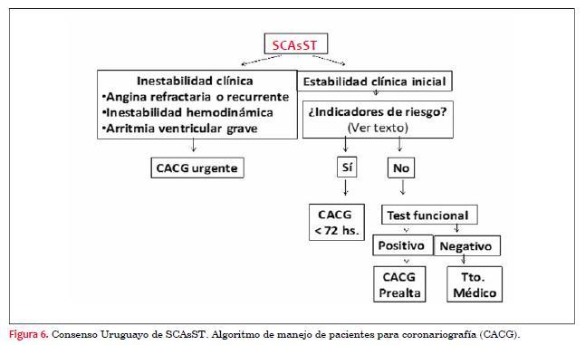 5. El Consenso Uruguayo de SCAsST del año 2009(21) ha pautado que el estudio angiográfico se haga en las primeras 72 horas (figura 6). No se recomendó un tiempo más acotado dado que las conductas más agresivas en cuanto al tiempo han sido testadas con tratamientos antitrombóticos que no se utilizan rutinariamente en nuestro medio. Sin embargo, debe destacarse que múltiples ensayos han mostrado la seguridad de una estrategia de mayor precocidad y en el estudio TIMACS su beneficio clínico en los pacientes de alto riesgo.