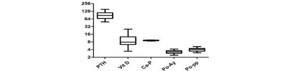 B) Magnitud de las alteraciones monitoreadas: PTH: 91±27 pG/ml, Vit D. 10±6 nG/ml, Ca-P: 9,01±0,25 mgs/dl, Po-Ay: 3,26±0,47 mgs/dl, Po-pp: 4,03±0,65 mgs/dl (p< 0,01). (gráfico 1)