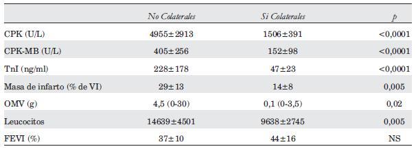 Resultado: la edad media fue 57±14 años, el 68% fueron mujeres. El 87% de los pacientes con circulación colateral presentaban angina previa al evento vs 28% no Colaterales (p=0,004). Los resultados principales se muestran en la tabla.