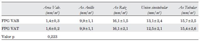 Resultado: se estudiaron 20 FPG de pacientes con VAB y 19 FPG de pacientes con VAT. Los dos grupos fueron comparables excepto por la superficie corporal que fue mayor en los FPG de VAT. No se evidenciaron casos de bicuspidismo en la población estudiada. Las dimensiones en FPG de VAB y VAT fue similar. Ningún individuo estudiado presentó diámetros aórticos patológicos (tabla 10).