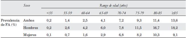 Resultado: la prevalencia de FA fue 2,0%, siendo mayor entre hipertensos que entre normotensos (3,9% versus 0,8%, p=0,00001) y entre diabéticos que entre no diabéticos (5,2% versus 1,8%, p=0,004). No hubo diferencia significativa por sexo (2,5% versus 1,7%, p=0,3) ni en relación a un IMC >25 o menor (p=0,19). En la tabla se presenta la prevalencia de FA por rango de edad y discriminada por sexo.