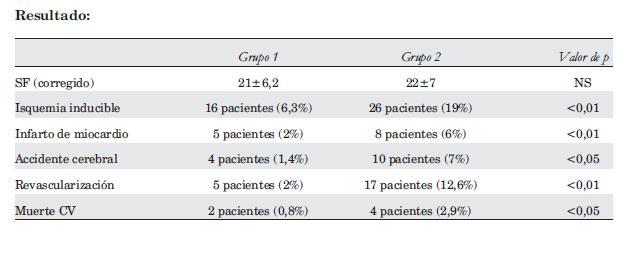 Resultados: Grupo 1: 74 pacientes, 43 SM, edad promedio 62,5 años, 91,8% HA, 37,8% DM, 27,7% IAM, 22,8% ATC, 0,7% CRM, 94,7% realizaron PEG. Grupo 2: 34 pacientes, 20 SM, edad promedio 60,6 años, 88,2% HA, 16,6% DM, 52,9% IAM, 47% ATC, 0,5% CRM, 91,1% realizaron PEG. No se encontraron diferencias significativas entre ambos grupos en las variables antes mencionadas. El SDS del grupo 1 fue mayor al del grupo 2 aunque no se alcanzó significación estadística (4,92 versus 3,47, p=0,23), pero el SDS sí fue mayor en los pacientes con SST en aVR > 2 mm que en los pacientes con 2 mm o menos (7,33 versus 4,45, p=0.009). El número de pacientes con AR y RI fue significativamente mayor en el grupo 1 (56,7% versus 23,5%, p=0,003). El compromiso del territorio de ADA fue significativamente mayor en el grupo 1 que en el grupo 2, tanto como único territorio (p=0,003), como cuando se asoció a Cx (equivalente TCI, p=0,003) o a cualquier otro territorio (p<0,001).