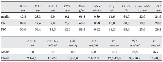Comparando los resultado con tablas internacionales: AA -3,04 mm/m2 (90%IC -3,38 - -2,70; p< 0,001); PS -2,94 mm/m2 (90% IC -3,51 – -2,37 ; p<0,001); PST -2,18 mm/m2 (90% IC -2,89 – -1,48; p <0,001); PT 0,66 mm/m2 (90% IC -1,3 – 1,4; p=0,099).