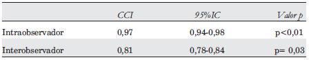 Método: estudio retrospectivo en el que se incluyeron 65 pacientes participantes de protocolo de búsqueda de fuentes de cardioembolia. Se realizaron en forma sucesiva dos Eco por dos cardiólogos independientes y ciegos entre sí. Se registraron medidas y valores ecocardiográficos que se compararon mediante coeficiente de correlación intra-clase (CCI). Se considero cómo adecuada un valor entre 0,4 y 0,75 y excelente valores mayores a 0,75. Se calculó el promedio de las diferencias entre las medidas y el DE.