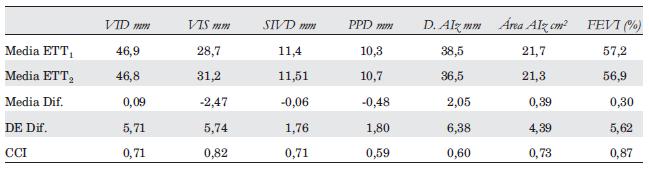 VID: ventrículo izquierdo en diástole; VIS: ventrículo izquierdo en sístole; SIVD: septum interventricular en diástole; PPD: pared posterior en diástole; D. AIz: Diámetro de AIz; Área AIz; FEVI: fracción de eyección de ventrículo izquierdo; DE: desvío estándar, Dif.: diferencia entre medidas Eco 1 y Eco 2.