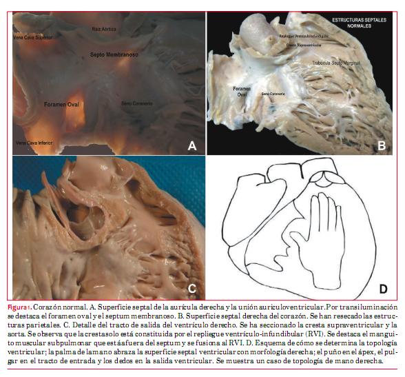 El corazón normal tiene un pliegue muscular prominente que separa la válvula tricúspide de la pulmonar. Es la cresta supraventricular y está constituida por el músculo de la curvatura interna del corazón y el repliegue ventrículo-infundibular (RVI), ya que no hay un verdadero septum de salida†. Las válvulas pulmonares están sostenidas por un manguito muscular que sobresale de la masa ventricular y se fusiona al RVI. La cresta supraventricular se inserta entre los brazos anterior y posterior de la trabécula septum-marginal (TSM), que es una gruesa estructura muscular vertical que refuerza la superficie septal (figuras 1 B y 1 C).
