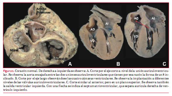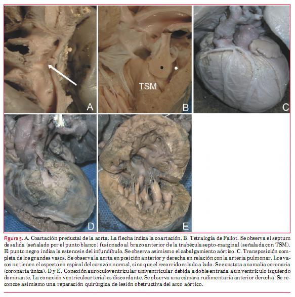 Esta patología se caracteriza por la presencia de estenosis subpulmonar, CIV, cabalgamiento de la aorta con origen biventricular e hipertrofia del ventrículo derecho. La hipertrofia antes del nacimiento es menos evidente. El nivel de cabalgamiento, el grado de estenosis y las características de la CIV son variables en los diferentes especímenes* (figura 5 B).