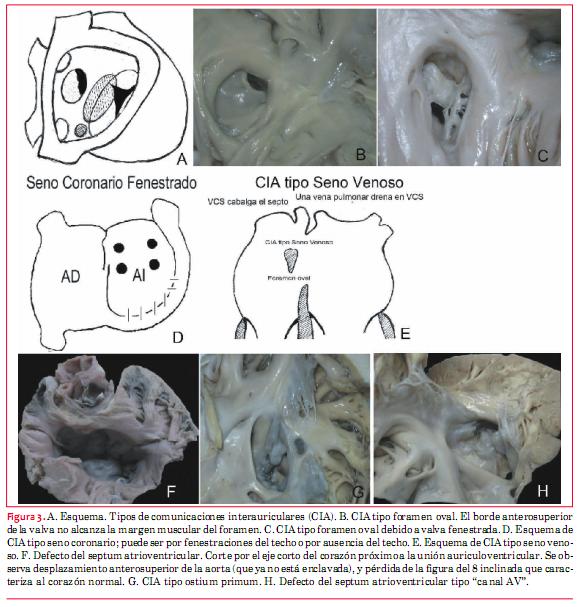 o La comunicación interauricular (CIA) tipo foramen oval es la más frecuente. Es la única CIA que está dentro del septum auricular. Es conocida también como ostium secundum. El corazón tiene tres septum: el interauricular, el interventricular y el membranoso. El septum interauricular está constituido por la valva del foramen oval y el borde anteroinferior del foramen. El borde superior es una invaginación de la pared de las aurículas entre la llegada de la vena la cava superior a la aurícula derecha y las venas pulmonares derechas a la aurícula izquierda. En la parte anterior, el borde está constituido por la eminencia de Eustaquio y el vestíbulo de la aurícula, y en la inferior por el septum venoso que separa la abertura de la vena cava inferior del seno coronario. Cuando la valva del foramen no cubre el anillo de la fosa oval en circunstancias en que la aurícula derecha no está dilatada, decimos que hay una CIA tipo foramen oval*. También cuando esta valva está fenestrada o ausente.
