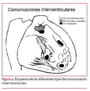 La comunicación interventricular (CIV) se describe por el lugar en que se abre en ventrículo derecho (entrada, sector apical o porción de salida). Cuando son grandes se definen como confluentes. Se reconocen tres tipos de CIV: musculares, perimembranosa y de doble cometido (yuxta-arterial) (figura 4).