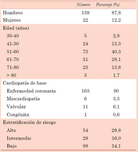 En el período analizado se incuyeron 181 pacientes. La edad promedio de los pacientes fue de 58,7 ± 9,7 años (35 a 83 años) (tabla 1), con predominio del sexo masculino 159 (87,8%). La patología cardíaca más frecuente fue la isquémica, presente en 163 pacientes (90,1%), siendo el resto portadores de insuficiencia cardíaca y patologías valvulares cursando el posoperatorio. De acuerdo a los criterios del Consenso de Rehabilitación CV y Prevención Secundaria de las Sociedades Interamericana y Sudamericana de Cardiología del año 2013, 54 (29,8%) pacientes cumplían con el criterio de alto riesgo, 29 (16,0%) eran de riesgo intermedio y 98 (54,1%) eran de bajo riesgo. Todos los pacientes de la población estudiada se encontraban en la fase II o III de la RC, es decir, en el período de la rehabilitación ambulatoria luego del alta hospitalaria inmediata o alejada, respectivamente.