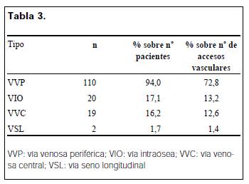 Se realizaron 20 vías intraóseas, lo que correspondió al 17,1% de los pacientes y el 13,2% de los accesos vasculares.