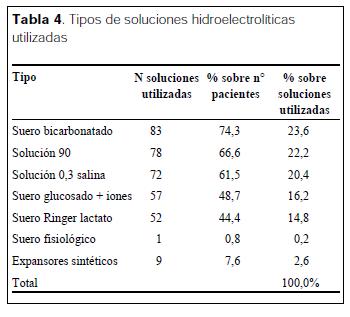 El suero bicarbonatado fue utilizado en 83 pacientes (74,3%) y correspondió al 23,6% del total de las soluciones utilizadas.