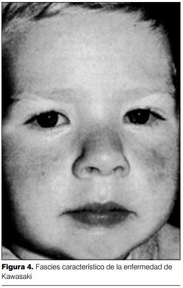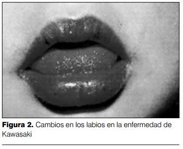 3) Cambios en labios y boca: los cambios en los labios se manifiestan por eritema, sequedad, fisuras y sangrado espontáneo o al mínimo tacto (figura 2). A nivel de la boca se evidencia eritema de la mucosa oral y faríngea, lengua aframbuesada con papilas prominentes eritematosas (figura 3). No se observan ulceraciones, exudados, ni manchas de Koplik. La lengua aframbuesada no es específica de la EK, y puede estar presente en otras enfermedades mediadas por toxinas (enfermedades estreptocóccicas y estafilocóccicas). Las alteraciones en ojos y boca determinan una imagen características (figura 4).