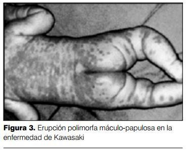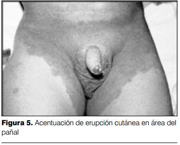 4) Erupción cutánea: las manifestaciones cutáneas pueden adoptar varias formas de presentación. Lo más característico es la presencia de un rash cutáneo eritematoso, polimorfo, máculo-papular no específico (figura 3). En ocasiones se presenta una erupción de tipo escarlatiniforme o con manifestaciones similares al eritema polimorfo. No se presentan vesículas ni bullas. En ocasiones pueden presentarse pequeñas pústulas, sobre todo en las zonas de extensión. Las lesiones elementales pueden acompañarse de púrpura, lo que es poco frecuente, pero característico. Las manifestaciones cutáneas se acentúan con la fiebre y son cambiantes. El eritema cutáneo es más marcado en el área del pañal, siendo fácilmente confundido con una dermatitis del pañal o candidiasis (figura 5). Las manifestaciones cutáneas en el área perineal también se presentan en enfermedades estreptocóccicas y estafilocóccicas.