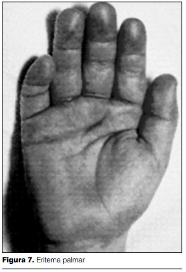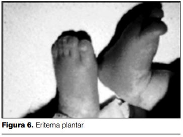 5) Cambios en las extremidades: a nivel de las extremidades se presenta eritema bilateral de las palmas y de las plantas (figuras 6 y 7). Se caracteriza por ser intenso, con cambios abruptos, llegando a desaparecer, dejando una piel de características normales, para posteriormente reaparecer. Se intensifica con la fiebre.