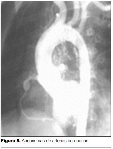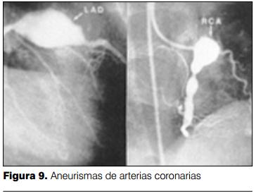 El desarrollo de aneurismas coronarios se vincula con el riesgo de muerte súbita, por trombosis coronaria e infarto agudo de miocardio. En el seguimiento a largo plazo de los pacientes con dilataciones coronarias y aneurismas, se evidenció que el retroceso de las anomalías coronarias es un hecho frecuente, hasta en 50% de los casos, y en los restantes se evidenció disminución del tamaño de aneurismas, con o sin estenosis coronaria (25%), retroceso de aneurismas pero con estenosis coronaria (15%) y en los restantes finas irregularidades de los vasos coronarios pero sin estenosis (10%). En seguimientos a largo plazo, se estima que 40% de los pacientes con aneurismas coronarios persistentes y estenosis coronaria desarrollan infarto de miocardio (38).