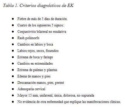 En el año 1978 se publicaron en EE.UU., por parte del Centro de Control y Prevención de Enfermedades, los criterios diagnósticos de la EK, modificando los originales de T. Kawasaki (8). Después de la publicación de la eficacia de la inmunoglobulina de uso intravenoso (IGIV) para el tratamiento del púrpura trombocitopénico idiopático, se comenzó a utilizar en Japón este régimen terapéutico para la EK (1). En el año 1988 la Academia Americana de Pediatría (AAP) aprobó el uso de IGIV más ácido acetilsalicílico (AAS) (9) y en el año 1993 la American Heart Association (AHA) publicó los criterios diagnósticos y guía terapéutica de la EK (10). Más recientemente, se propusieron nuevos tratamientos con esteroides y agentes antiinflamatorios para aquellos casos de EK que no responden al tratamiento clásico (11,12).