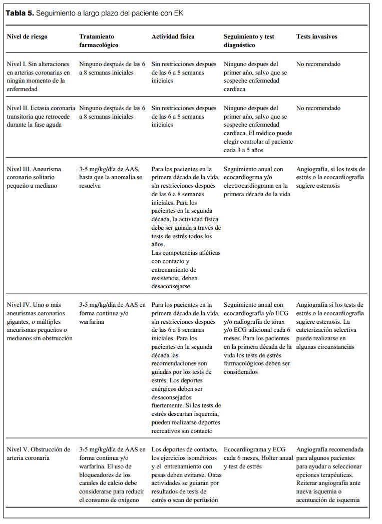 El manejo a largo plazo de los pacientes con EK depende del grado de afectación de las arterias coronarias y se realiza en base a la estratificación por grupos según el riesgo relativo de isquemia miocárdica. La AHA propone el esquema de seguimiento que se ve en la tabla 5 (77). El seguimiento por especialistas requiere el acceso a tecnología de estudio avanzada como: ergometría de esfuerzo, tests de estrés farmacológicos (dobutamina, dipiridamol, adenosina) para niños pequeños que no pueden realizar esfuerzo físico en bicicleta o en la cinta, estudios radioisotópicos de perfusión miocárdica, valoración con ecocardiografía de la motilidad regional de la pared ventricular, utilización de resonancia nuclear magnética, etcétera.