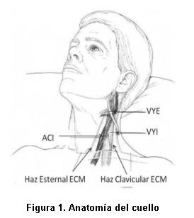 Anatómicamente, la VYI se encuentra en posición antero-lateral a la arteria carótida interna, cubierta por el músculo esternocleidomastoideo (ECM) y termina detrás del borde interno del haz clavicular de dicho músculo, a nivel del extremo interno de la clavícula al unirse a la vena subclavia para formar el tronco braquiocefálico venoso (figura 1) (7).