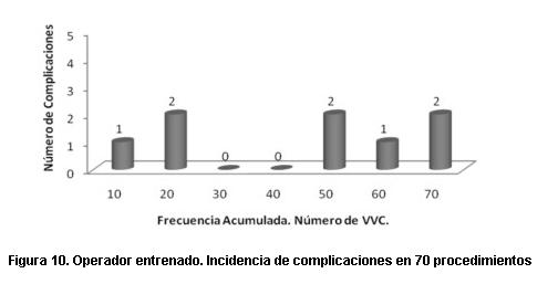 - El diseño del trabajo, en el cual utilizamos el límite de 70 procedimientos para definir a un operador como experto. Dicho límite puede ser muy elevado, ya que una observación posterior de nuestros datos nos indica que para el operador que realizó la mayoría de los procedimientos en el grupo no experto, la mayoría de las complicaciones ocurrieron en los primeros 30 procedimientos, en tanto que para el operador que realizó la mayoría de los procedimientos en el grupo experto, la incidencia de complicaciones fue constante a lo largo de todo el trabajo. Ello concuerda con bibliografía que determina que un operador es experto al llegar a 50 procedimientos. Si fuera así, muestro grupo de “no expertos” sería en realidad un grupo medianamente entrenado, existiendo menores diferencias que las esperadas entre ambos grupos (figuras 9 y 10).