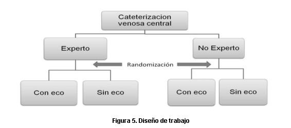 Métodos: se estudiaron 257 pacientes que se dividieron según la experiencia del operador: “experto=E” (más de 70 accesos centrales realizados previos al estudio) y “no entrenamiento=NE”. El grupo “E” realizó 152 accesos venosos y 105 el grupo “NE”. Se incluyeron todos los pacientes que requirieron VVC a partir del inicio del período de estudio en el CCE y sala de operaciones del Hospital Central de las Fuerzas Armadas (HCFFAA). Los procedimientos se randomizaron en “sin ecografía=S/E” (80-“E” y 54-“NE”) y “con ecografía=C/E” (72-“E” y 51-“NE”).