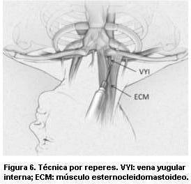 Se utilizó el abordaje central del VYI en todos los casos. El vértice del triángulo de separación de los haces esternal y clavicular de músculo ECM se utilizó como reper anatómico (triángulo de Sedillot). La VYI se encuentra en situación profunda en dicho espacio (figura 6). Para la colocación de las vías centrales se utilizó el kit de VVC EPSA (Electroplast SA, Montevideo). La cateterización se realizó en condiciones estériles. La piel se preparó con clorhexidina alcohólica, se colocaron campos estériles. El operador utilizó gorro, tapaboca, sobretúnica y guantes estériles. Se infiltró piel con lidocaína al 1%. El paciente se colocó en Trendelemburg con la cabeza rotada 45º hacia el lado contralateral a la punción. Se identificó el pulso carotídeo y se puncionó a nivel del vértice del triángulo de Sedillot dirigiendo la aguja hacia la aréola homolateral. Una vez que se comprobó la aspiración de sangre, se colocó la VVC con técnica de Seldinger. En los casos en los que no se identificaron los reperes anatómicos descritos se puncionó 1cm por fuera del latido carotídeo palpado a distancia media entre el ángulo del maxilar inferior y la clavícula. Se realizó control de posición de catéter central con radiografía de tórax en todos los casos.