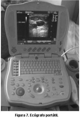 La preparación del paciente es la misma que para la técnica anterior. Para todos los procedimientos utilizamos un ecógrafo portátil (Logic Book XP, GE Medical Systems, EE.UU.) en modo bidimensional (2D) (figura 7) con transductor lineal de 8 Mhz. El transductor se cubrió con gel de ultrasonido y se envolvió en bolsa de plástico estéril. Sobre la piel del paciente utilizamos suero fisiológico estéril para eliminar la interfaz de aire entre la piel y la bolsa plástica. El transductor se colocó en forma transversal al eje del cuello del paciente a nivel de la separación de los haces esternal y clavicular del músculo ECM o, de no ser palpables, lateral al eje visceral en el punto medio entre el ángulo del maxilar inferior y la clavícula. Rápidamente se identificó la arteria carótida interna como una estructura redondeada, pulsátil e incompresible. La VYI se identifica por encontrarse por delante y por fuera de la arteria, ser compresible y no pulsátil. La figura 8A muestra la vista transversal de los vasos con la VYI en posición anterior a la ACI. La figura 8B muestra la compresibilidad de la VYI al hacer presión con el transductor, se observa que la ACI no cambia de diámetro. La cateterización se intentó después de comprobar su compresibilidad. En caso de encontrar una vena no compresible (trombo intraluminal) se intentó la cateterización en el lado contralateral. Los procedimientos se realizaron por un solo operador que realizó la ecografía y la punción simultáneamente (monooperador). La penetración en la vena se objetivó al observar la punta de la aguja de punción dentro de la vena (figura 8C) o al obtener retorno sanguíneo en caso de no ser posible lo anterior. Una vez dentro de la vena, la VVC se colocó con técnica de Seldinger. En la figura 8D mostramos una vista longitudinal con el catéter introduciéndose en la VYI. Posteriormente se realizó control radiográfico como en la técnica anterior.