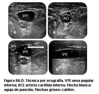 Bond y colaboradores (26) comunican la primera cateterización de la VYI con ultrasonido en modo 2D (bidimensional). Mediante esta técnica se visualiza en forma directa las estructuras del cuello (principalmente la VYI y la ACI) y el avance de la aguja de punción hasta su penetración en la VYI. Mallory y colaboradores (20) publican un estudio prospectivo y randomizado de esta técnica contra la clásica por reperes anatómicos comunicando una mayor tasa de éxitos, menor número de intentos y menor número de complicaciones inmediatas. Adicionalmente reporta que los pacientes en quienes falló la VVC por reperes anatómicos se pudieron cateterizar bajo ecografía en el mismo sitio de punción. Estos resultados fueron confirmados por múltiples estudios prospectivos randomizados posteriores en los que se reporta una tasa de éxito de 98% a 100%, complicaciones <5%, reducción en el tiempo para realizar la VVC <50% y reducción en el número de punciones <50%, comparado con la técnica por reperes anatómicos (15,18,21,27-29).