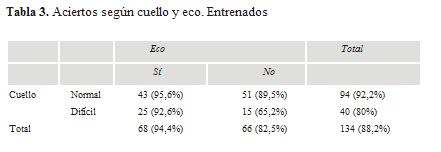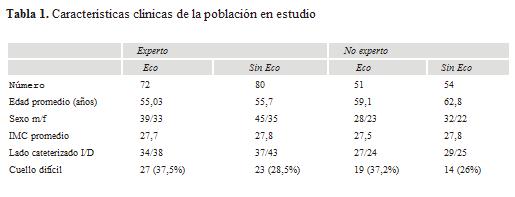 Para el grupo no entrenado (n cuello difícil = 33) encontramos una tasa de acierto de 79% con el eco (15 de 19) y 71% sin eco (10 en 14). Ocurrieron tres complicaciones con el eco (15,8%) y una sin el eco (7,1%). No hubo diferencia estadística en este caso, ni para aciertos ni para complicaciones.