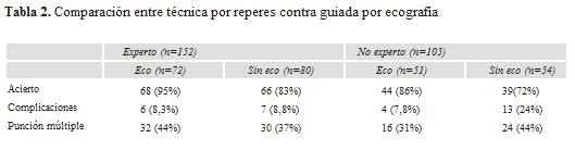 En el no experto se registraron 17 complicaciones (16,2%), cuatro con el eco y 13 sin el eco. Aquí sí hubo diferencia estadística significativa a favor del uso del ecógrafo en este subgrupo (p<0,05). En cuanto al número de pacientes multipuncionados, como muestra la tabla 2, para los operadores entrenados fue mayor en el grupo con eco que sin eco (44% vs 37%) en tanto que los operadores no entrenados registraron más punciones sin el eco (31% vs 44%). Las diferencias en ambos grupos no fueron significativas (p<0,05).