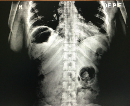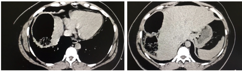 Se realizo una radiografía abdominal que revela la presencia de pseudoneumoperitoneo (Fig.1). Posteriormente, una tomografía computarizada abdominal evidencia colon derecho sobre la superficie hepática (Fig.2).
