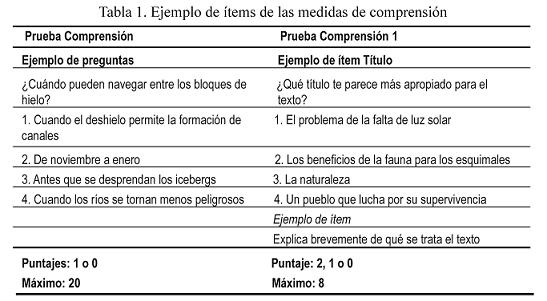 Por otra parte se agregan dos nuevos ítems a cada texto que responden a la construcción de procesos más próximos a los procesos de integración o construcción del modelo de situación: titular el texto y explicar en no más de tres proposiciones el tema sobre el que trata. Esta segunda prueba además de demandar tareas de comprensión profunda, se diferencia de la primera medida de comprensión por involucrar escritura. Estos cuatro ítems se pueden puntuar con 2, 1 o 0 por lo que se puede alcanzar un máximo de 8 puntos. Se llamará a esta medida Comprensión 1. Esta prueba tiene una confiabilidad de 0.5 según el alfa de Cronbach.