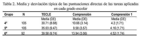 En la Tabla 2 se muestran la medias y las desviaciones típicas de las puntuaciones directas de las distintas tareas aplicadas en función del grado escolar.