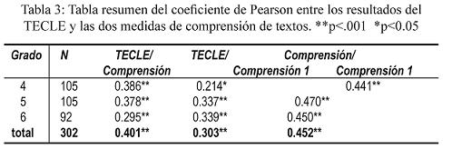 En la Tabla 3 se presentan los resultados de las correlaciones entre la prueba TECLE con puntuaciones directas y las dos medidas de comprensión de textos con toda la muestra y por curso.