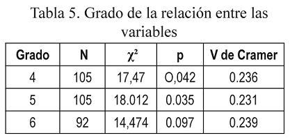 Encontramos que las variables están asociadas de forma significativa en 4º y 5º grado escolar, no así en 6º. Se calcula la fuerza de la relación a través del coeficiente V de Cramer que es el procedimiento indicado cuando las tablas tienen más de dos categorías por variable, y se evidencia una fuerza de asociación de moderada a baja.