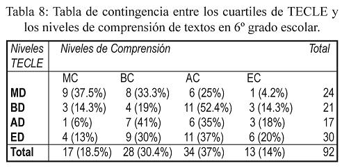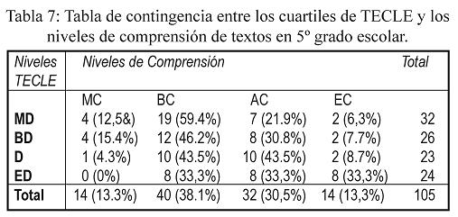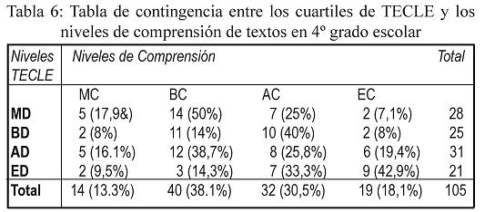 El primer análisis informa de una correlación moderada entre los diferentes componentes de la lectura evaluados (r=.40, r=.30 y r=.45). Se realiza un segundo análisis donde se establecen cuatro niveles de desempeño por grado escolar, para las dos variables de lectura que muestran mayor fiabilidad: Tecle y Comprensión. Se utilizaron los centiles de la Prueba TECLE y se establecieron cuartiles para las pruebas de Comprensión en función de la media y sus desvíos estándar. Diferenciamos así cuatro niveles de desempeño que se presentan en la Tabla 4. Con la prueba χ² se buscó analizar la relación entre los niveles identificados en la Prueba TECLE y los niveles de comprensión, ambos agrupados en cuartiles (ver Tabla 5).
